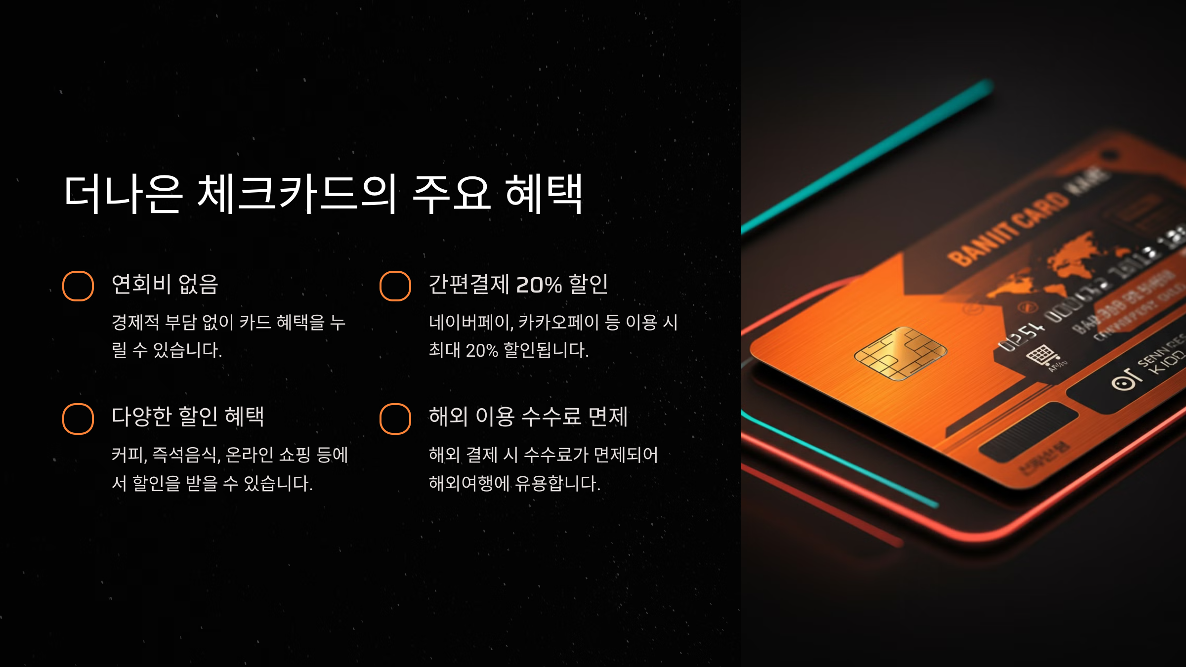 - 연회비 없음 : 더나은 체크카드의 가장 큰 장점은 연회비가 전혀 없다는 점입니다. 연회비에 대한 걱정 없이 카드의 혜택을 누릴 수 있어 경제적 부담이 적습니다.